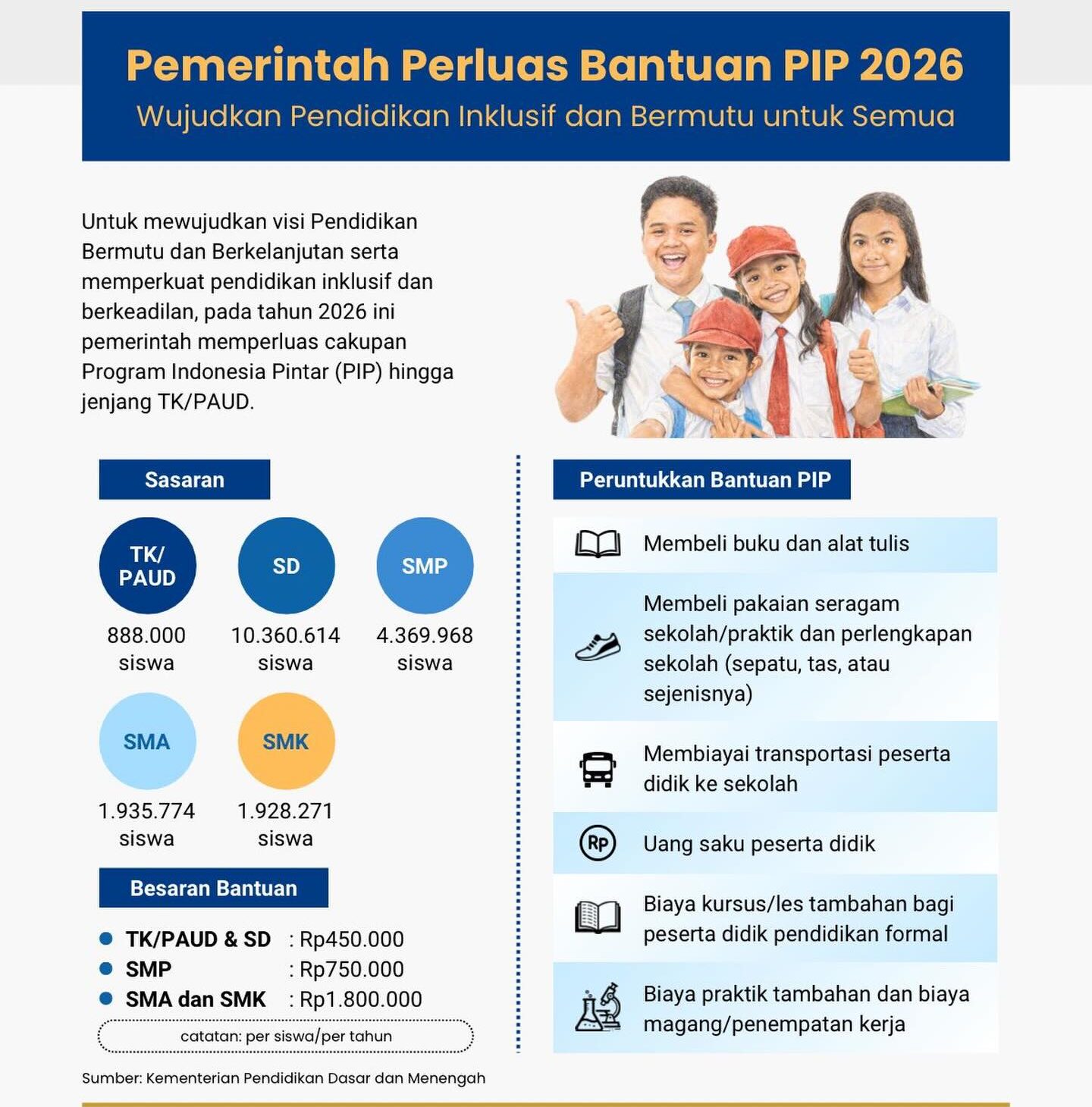 Perluasan cakupan PIP hingga jenjang TK/PAUD menjadi upaya strategis untuk memastikan dukungan pendidikan dapat dirasakan sejak usia dini, sehingga semakin banyak peserta didik memperoleh kesempatan belajar yang layak. pemerintah terus mendorong peningkatan kualitas sumber daya manusia Indonesia melalui akses pendidikan yang lebih merata dan inklusif.