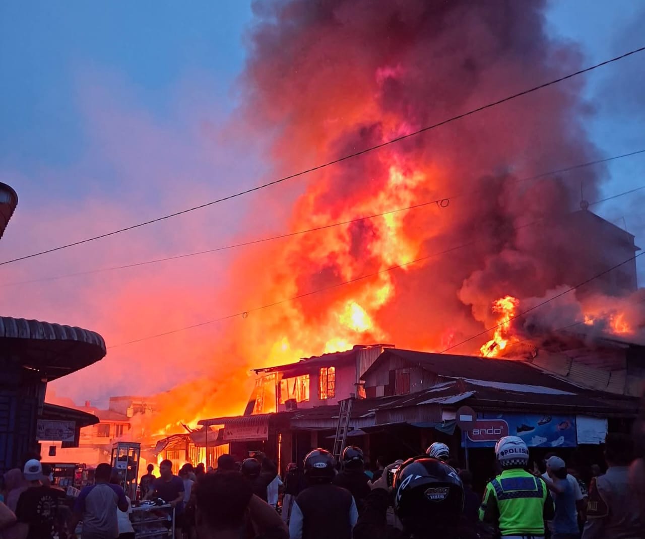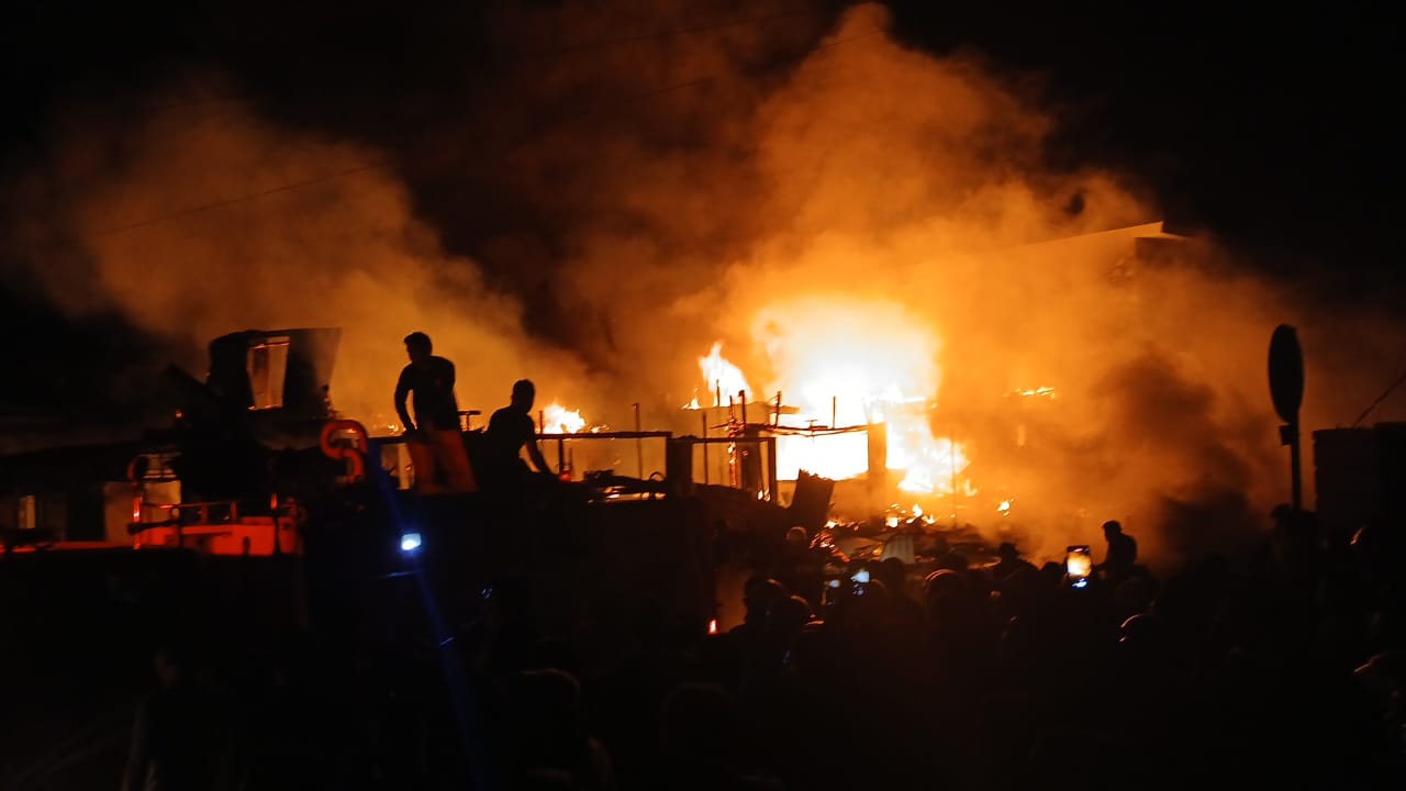 Pantauan di lokasi, kobaran api membubung tinggi disertai asap hitam pekat. Puluhan ruko yang sebagian besar digunakan sebagai toko pakaian dan sepatu rata dengan tanah. Ribuan warga berkerumun menyaksikan kejadian, menyebabkan kemacetan parah di ruas jalan sekitar.