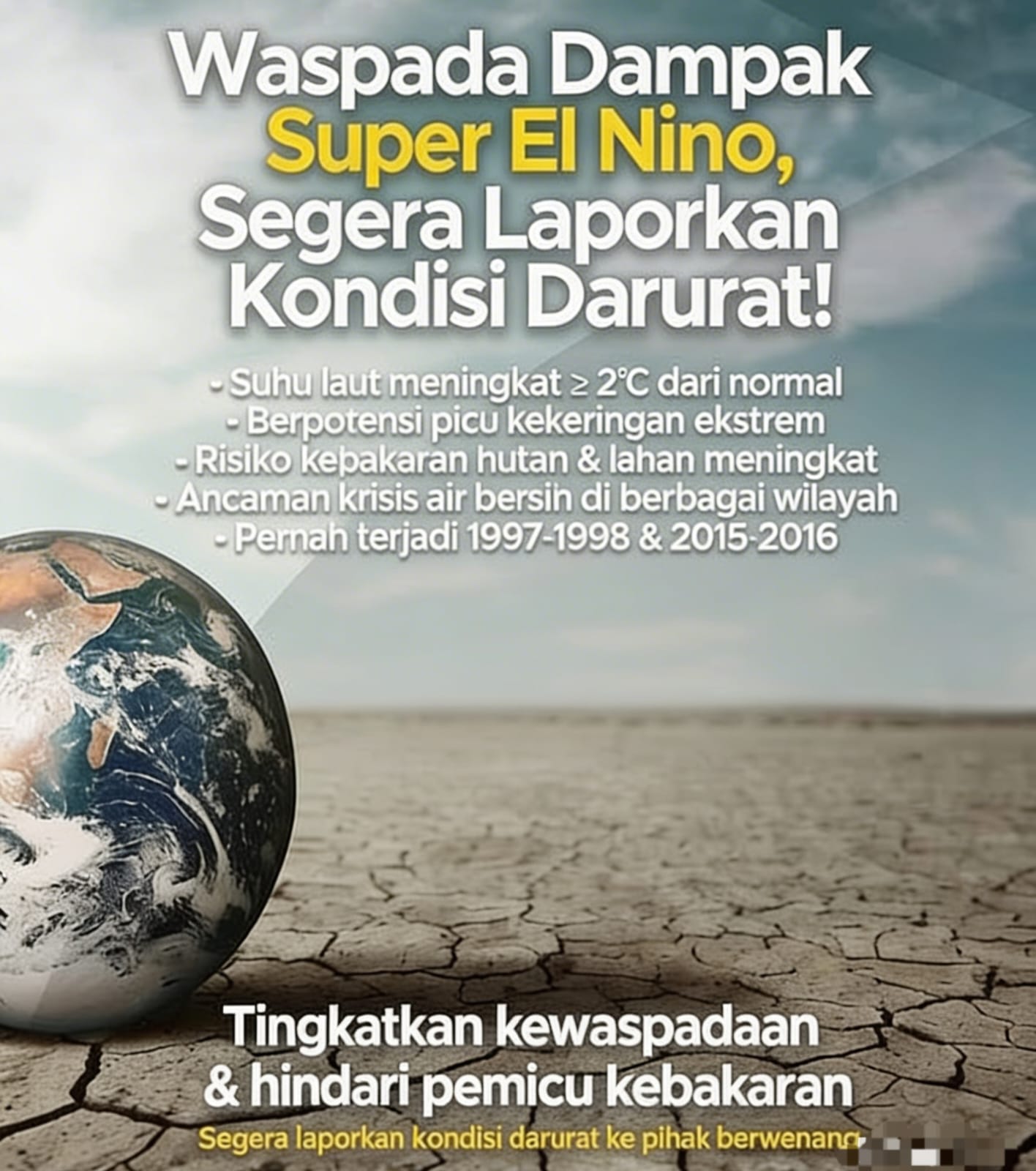 Pemerintah dan pihak berwenang mengimbau masyarakat untuk meningkatkan kewaspadaan, menghemat penggunaan air, serta menghindari aktivitas yang dapat memicu kebakaran. Apabila menemukan kondisi darurat seperti kebakaran, kekeringan parah, atau gangguan lingkungan lainnya, masyarakat diminta segera melaporkannya agar penanganan dapat dilakukan dengan cepat dan tepat.*(R/A)*.